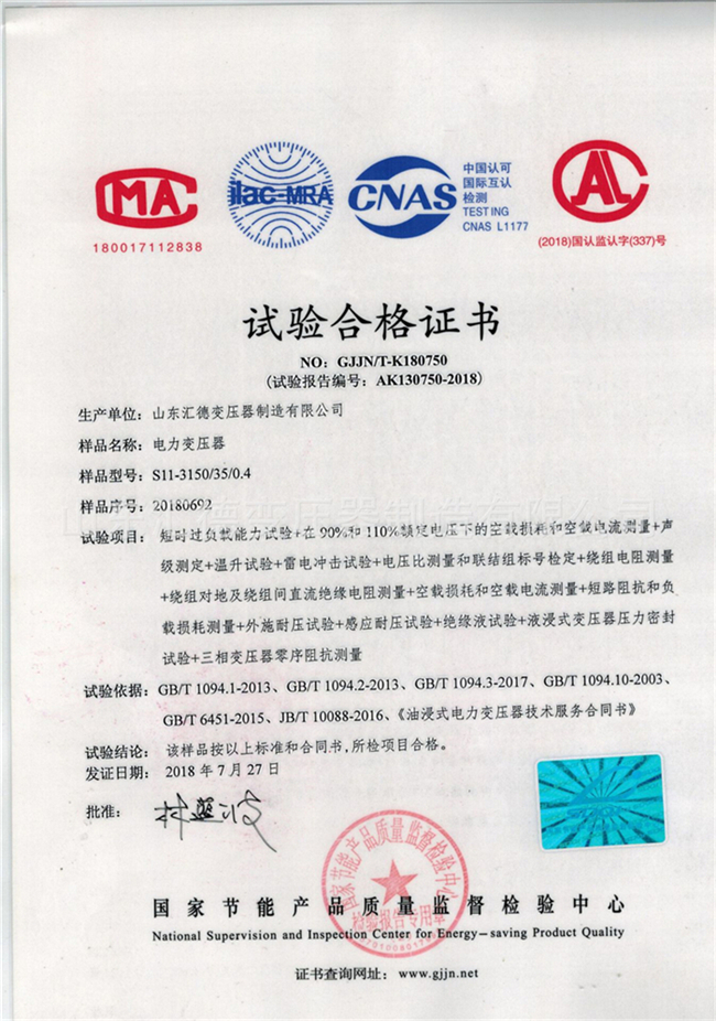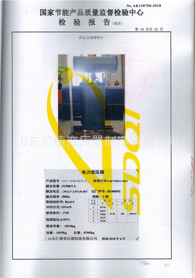 高低壓型式試驗(yàn)報(bào)告S11-3150/35/0.4電力變壓器(全套資質(zhì))--山東匯德變壓器制造有限公司